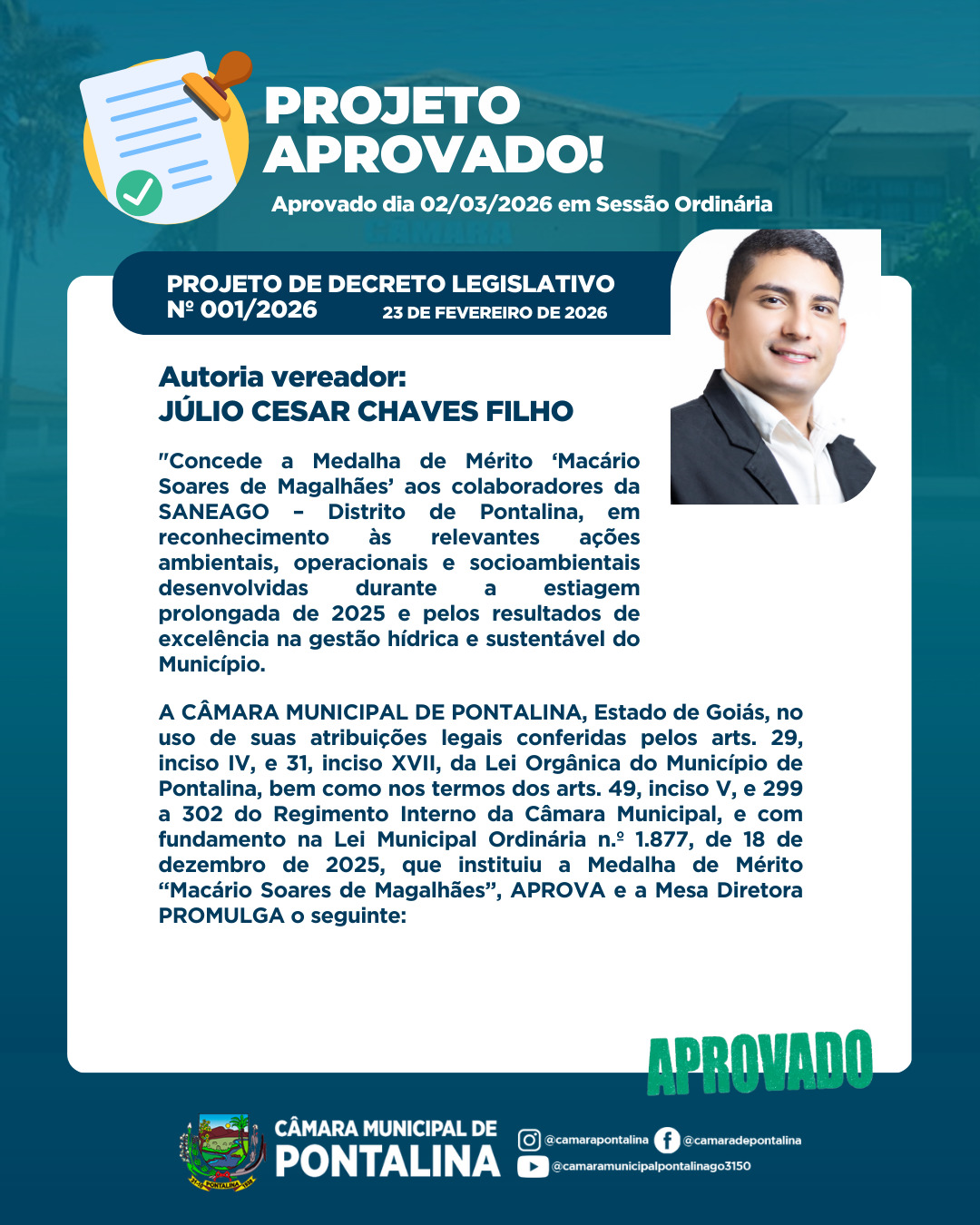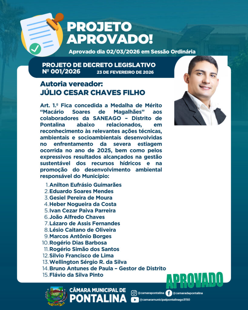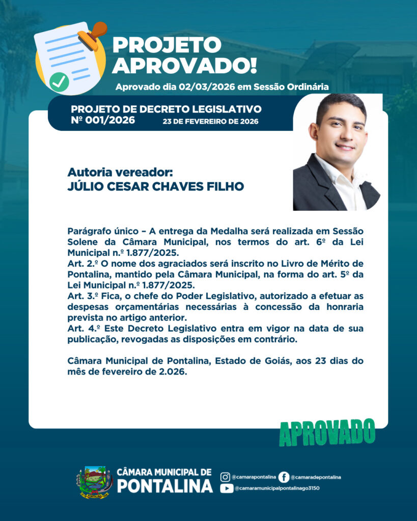 Foi aprovado Projeto de Decreto Legislativo, no Plenário Neif Mady em Sessão Ordinária – realizada no dia 02 de março na Câmara Municipal de Pontalina.