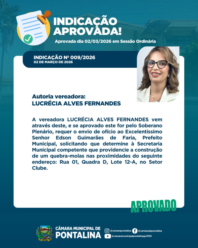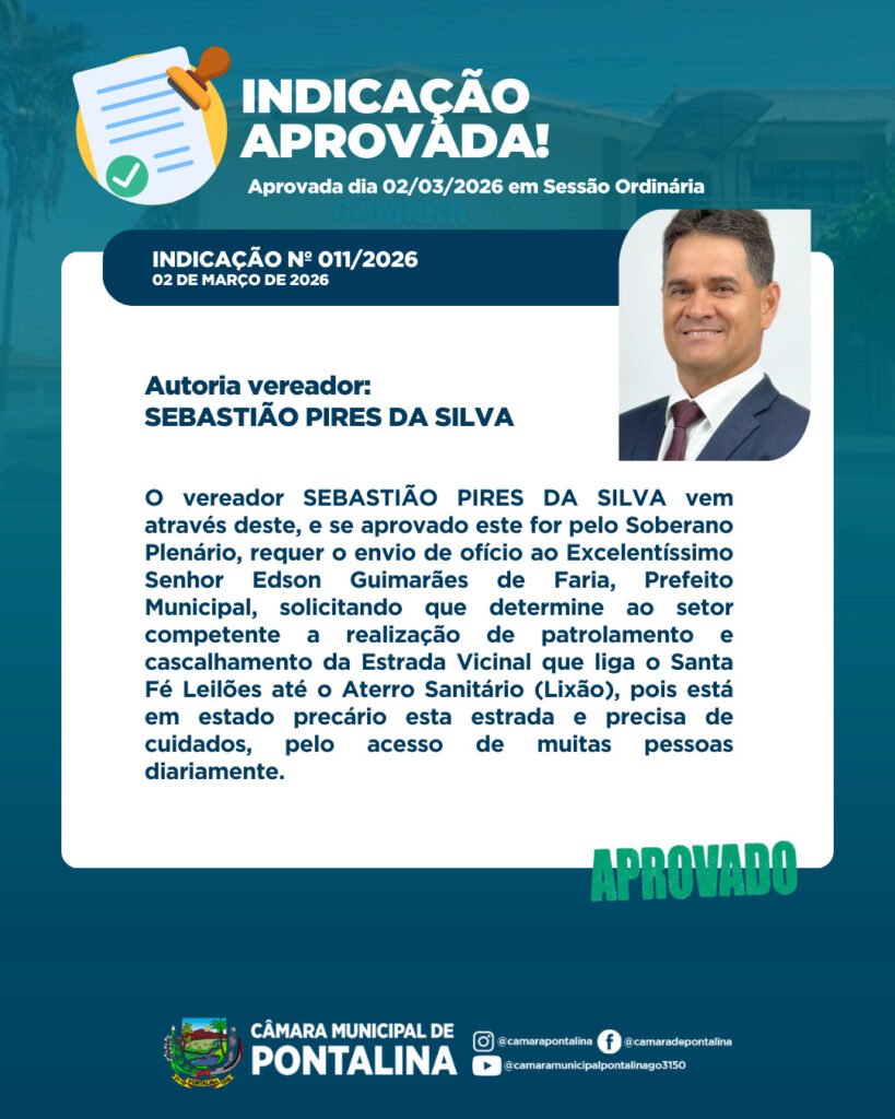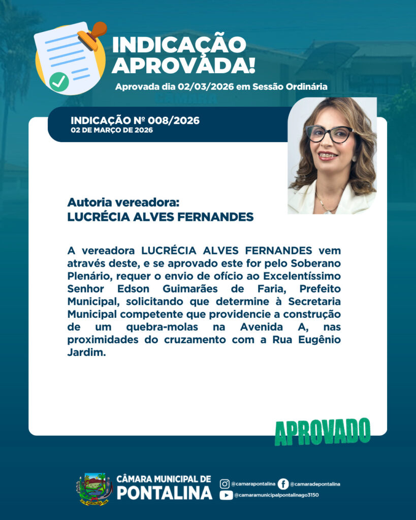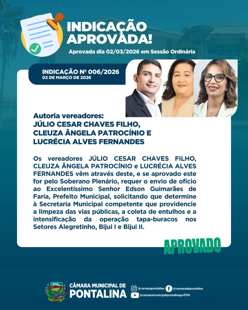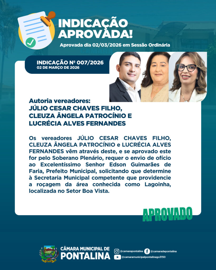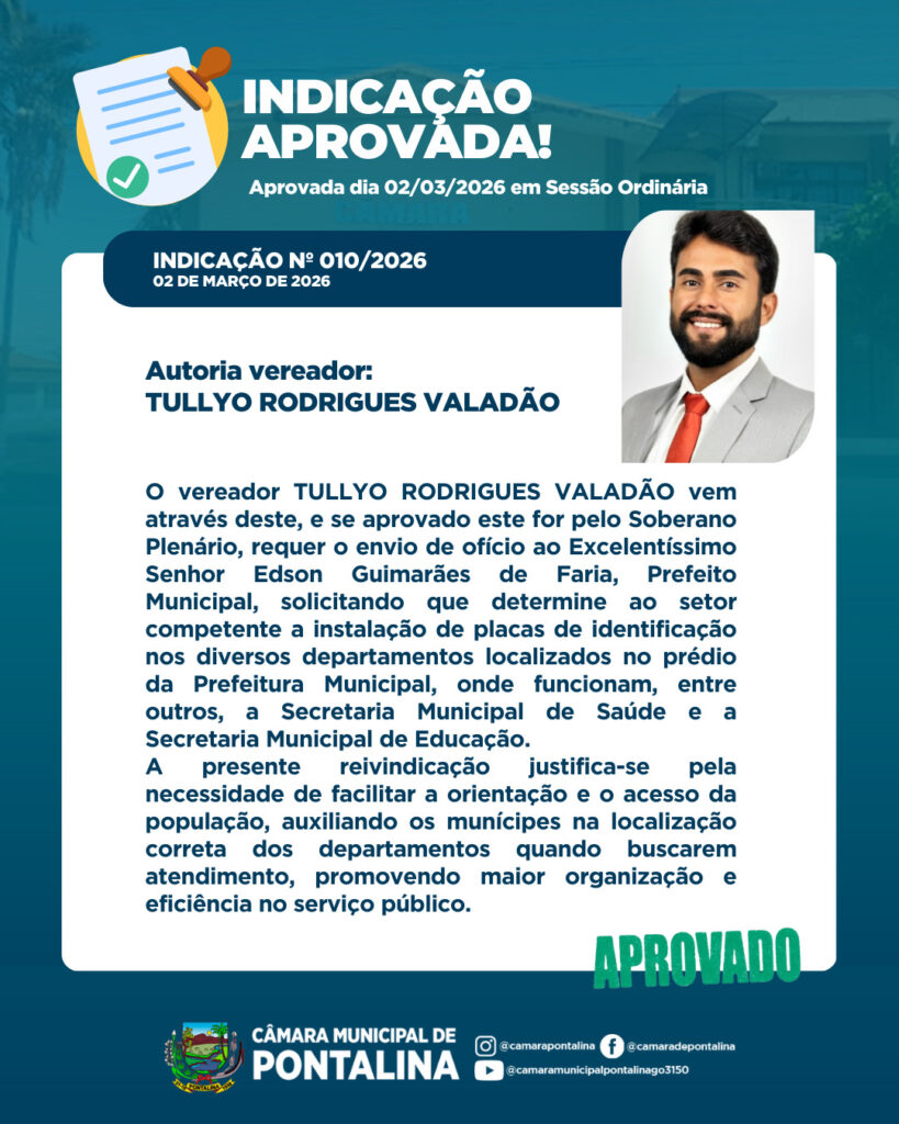 Foram aprovadas Indicações, no Plenário Neif Mady em Sessão Ordinária – realizada no dia 02 de março na Câmara Municipal de Pontalina.